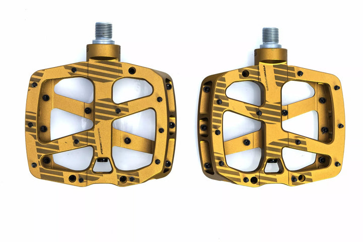 Our New Aluminum Plus Pedals Deliver Biking Traction, Killer Aesthetics, and a Slim, Rock-Deflecting Profile., In Keeping the Original 22-Pin Layout Used On Our First Lg1 Pedals, Our New Plus Aluminium Pedals Use EXACT SAME BITT Pedals Were So Well Known For., The 100 x 110mm Machined Aluminum Platform Houses The 22 Pins (11 per side), A Big Inboard Bearing and Two Outboard Bearings, and a Steel Axle. Fully rebuildable., Material: machined, anodized aluminum. , Pins: 5mm pine, steel pins. , Size: 100 x 110mm Platform Designed to Deflect Rock Strikes., Spindle: Heat-Treated Steel., Weight: 441 g.