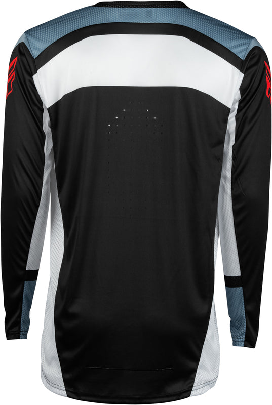 Laser-cut perforations for advanced ventilationZero-cuffs provide unrestrictive mobility and a comfortable fitMesh ventilation panels dissipate unwanted heatMulti-panel construction for maximum performance and comfortable fitLow profile streamlined taped collarExtended tail helps keep jersey tucked inAthletic Fit: Fits Close to the Body with Minimal Excess Collection: 2024.0 Color: Black & Gray & White Size: M USE: MX