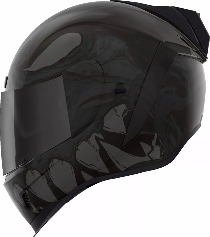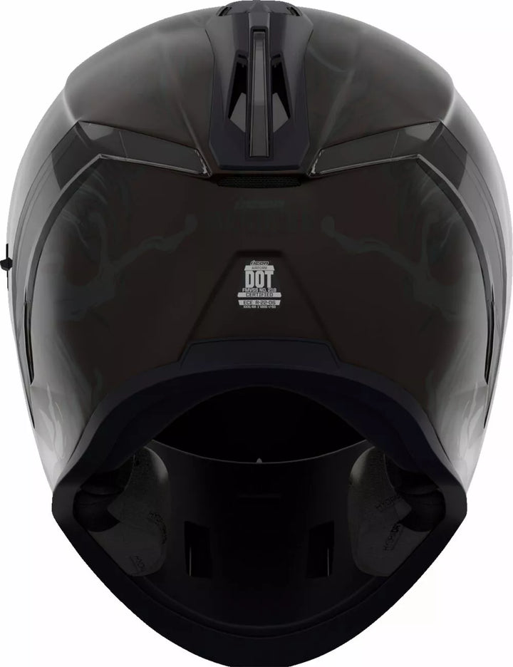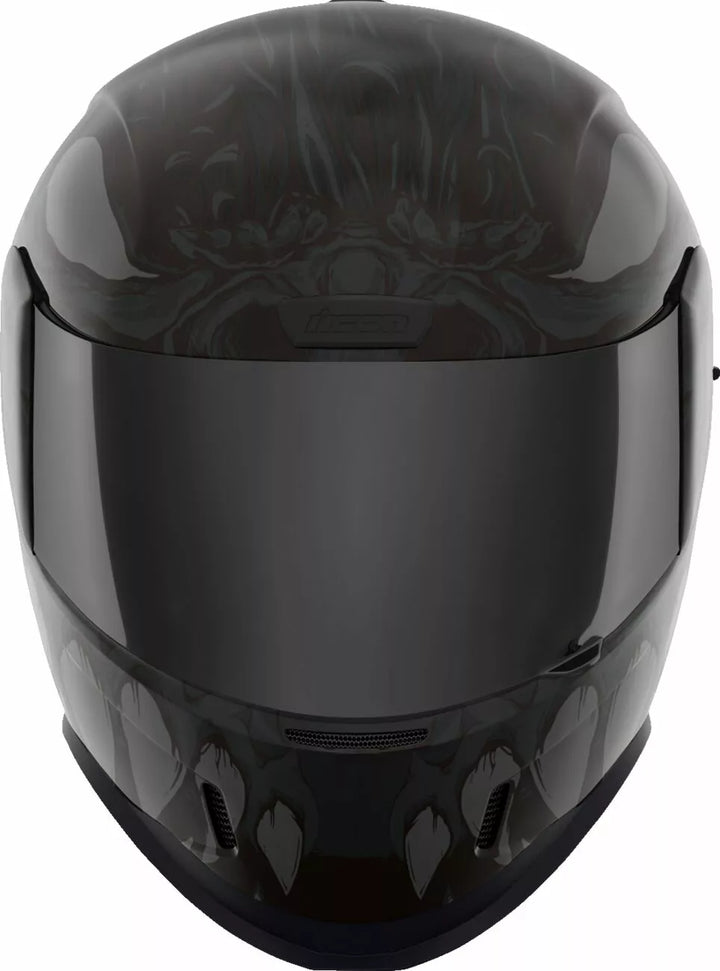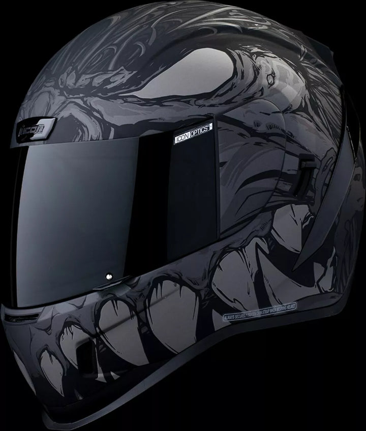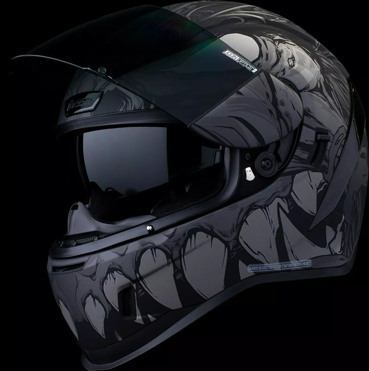 Continuous Venting System, FAG-FREE ICON OPTICS ™ Shield with Rapid-release ™ System, Injection Molded Polycarbonate Shell for Strength, Internal Airflow Geometry, Sculpted NECK Roll, Prolock ™ Switsch, the EXTERIOR WITH LOCKING SHIVING SWEQU Visor must only be used while the main face shield is in the fully closed position, removable Molded Breath Deflector, Removable Hydradry ™ 3-Piece Moisture Wicking Liner, Internal Speaker Pockets Work With Icon's R.A.U. Bluetooth Device, Includes Dark Smoke Dropshield ™ and Rubatone Black Speedfin ™