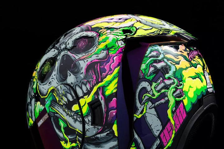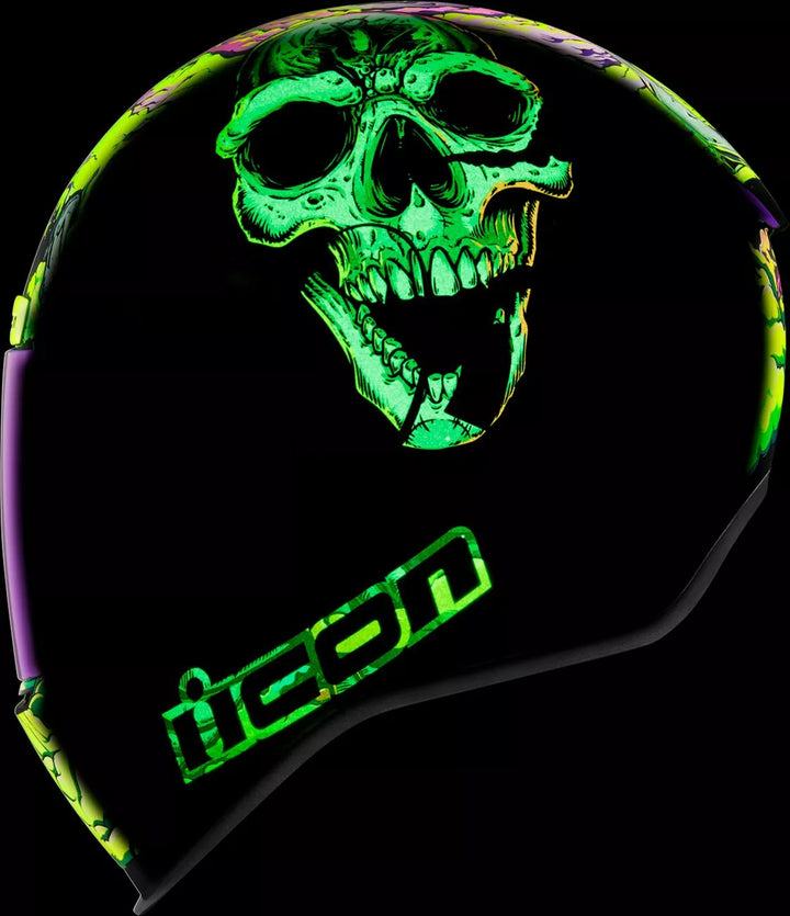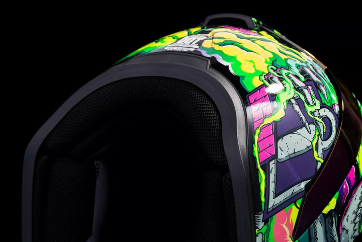 Injection-Molded Polycarbonate Shell for Strength and Durability, Intermediate Headform, Clear Fog-Free Optics ™ Shield Installed, Purple RST FAG-FREE OPTICS ™ Shield Included, Dark Smoke Locking System, PHELOK SHID ™ Removable Comfort Liner, Purple RST Spoiler Kit, Glow in the Dark Graphics, Internal Airflow Geometry, Continuous Venting System, Sculpted NECK Roll, FAG-FREE ICON OPTICS ™ SHIELD IS WITH RAPID-RELEAT The Fully Closed Position, Removable Molded Breath Deflector, Internal Speaker Pocket's Work with Icon's r.a.u. Bluetooth Device