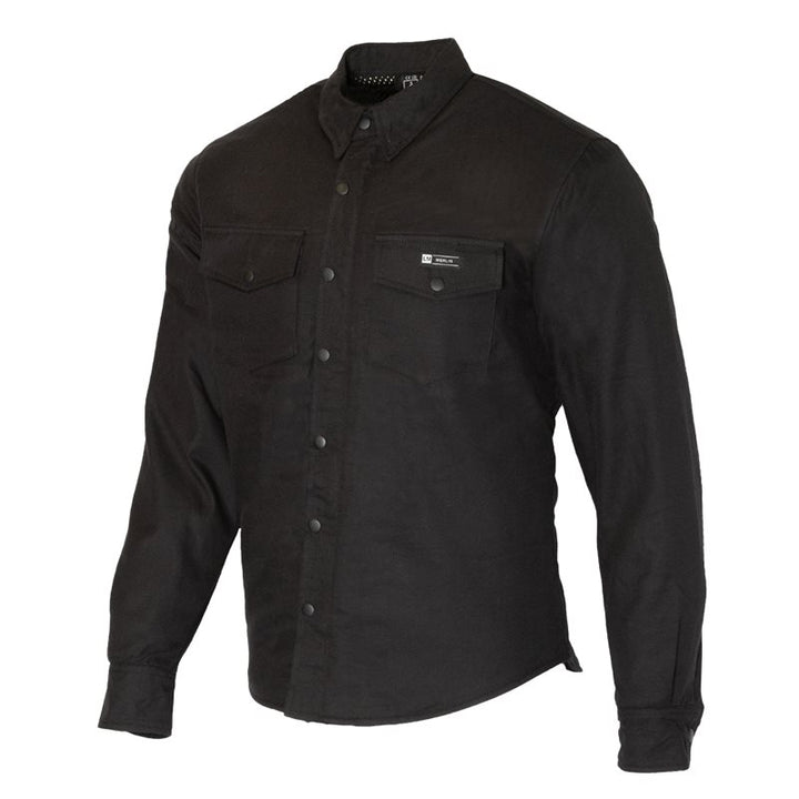 The Axe shirt has been designed to look like it fits in anywhere. The color makes it versatile, and the completely black premium cotton weave has full Kevlar® protection at 220gsm DuPont™. Included are D3O® LP1 Armanox protectors for shoulders and elbows, as well as a pocket for back protection. Approved according to CE EN17092 Level A standards. Details include two breast pockets with snap buttons, a collar with snap buttons, a rounded finish at the back, and a short-connectable zipper for pants and euro-hoop connection strap.