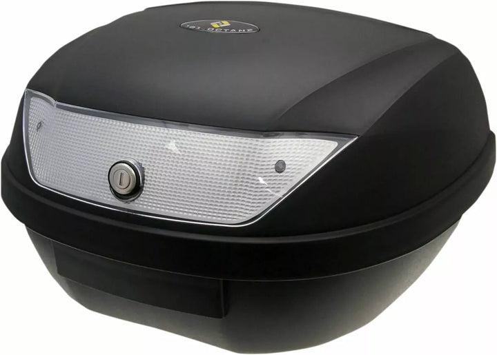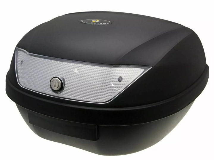 Universele topbox, zwart plastic, met slot. Geleverd met 2 sleutels en passende basis, gemakkelijk te bevestigen aan uw voertuig en snel vrijlating.