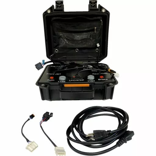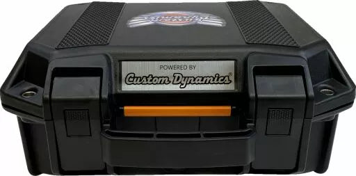 Custom Dynamics® producttestcase is een noodzaak in elke dealer of motorfietswinkel; Elimineer het giswerk in klantgarantieclaims en productproblemen met deze complete testkit, vooraf bedraad en uitgerust met pluggen voor het aansluiten van Custom Dynamics® meest populaire LED-verlichtingsproducten; Het heeft ook eenvoudig te gebruiken terminalconnectoren voor universele bedradingsproducten, deze compacte case-pluggen op een elektrische ontvang voor vermogen en heeft ingebouwde rem- en draai signaaltijdschakelaars voor het testen