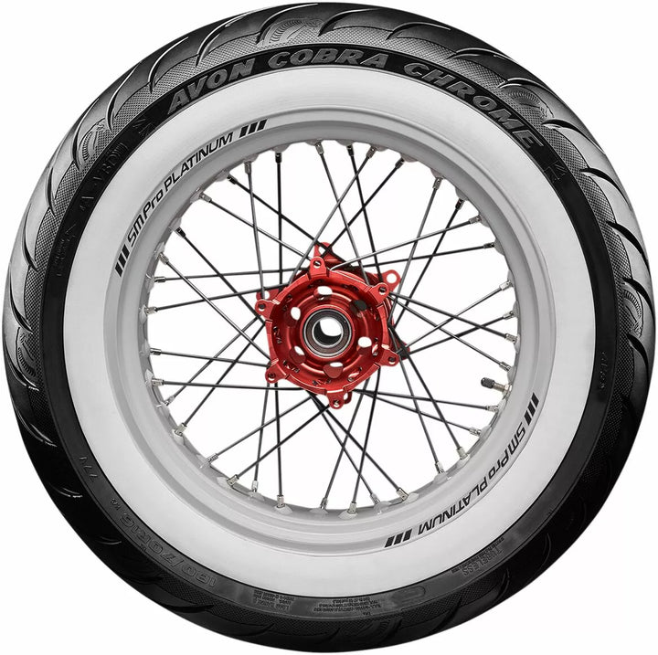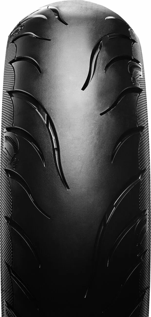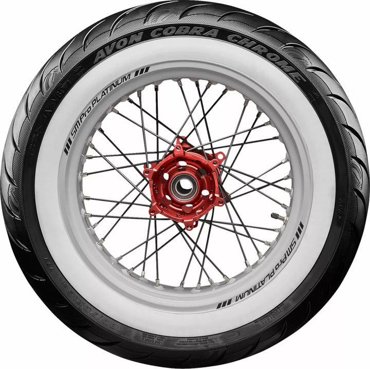 Avon's Latest Tech Pattern and Advanced Construction Produces Over A 5% Larger Footprint Compared To Avon Cobra, High Stability In All Conditions Deliveness Precise Feel and Tire Feedback, Better Traction and Shorter Stopping Distances, Even in the Wet, Incorporates Sports Tirive Longevity ヨ Perfect for Touring, Unique Tire Design with Detaileled Aesthetic Features, Improved Tire Life Over ITS Precessor, Snakeskin-Effect Treat, Reinforced, Aimed at the Power Cruiser/Touring/Custom Market.