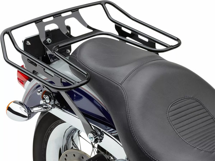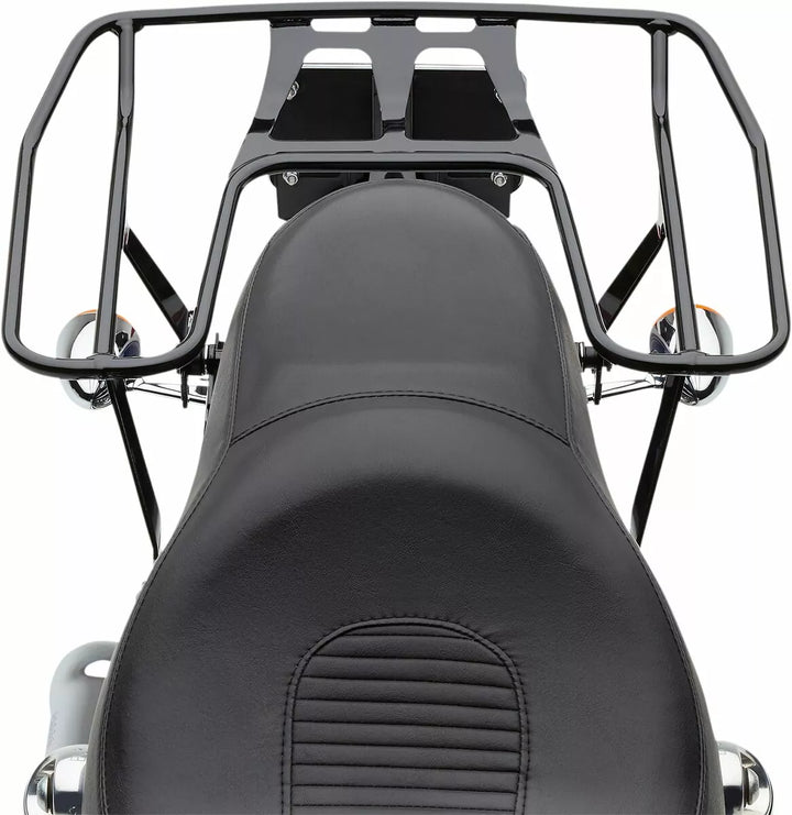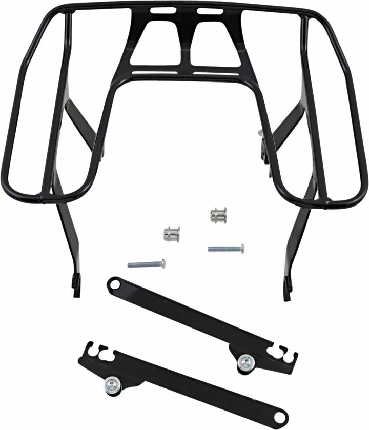De bovenkant van het rek is ongeveer niveau met de bovenkant van de stoel en elk rek heeft een kick -up in de achterkant, er zijn plaatsen om bungeekoorden of montagebanden te bevestigen, zodat je niet langer je fiets fen -spatbord hoeft te krabben terwijl je je lading beveiligt, montagehardware alta. Harley-Davidson-montagekit., Als de aftermarket-stoel geen Saddlemen of Lucky Daves stief-ups is, kijk dan strak naar de metingen van de opening om ervoor te zorgen dat het rek rond de stoel van uw fiets past.