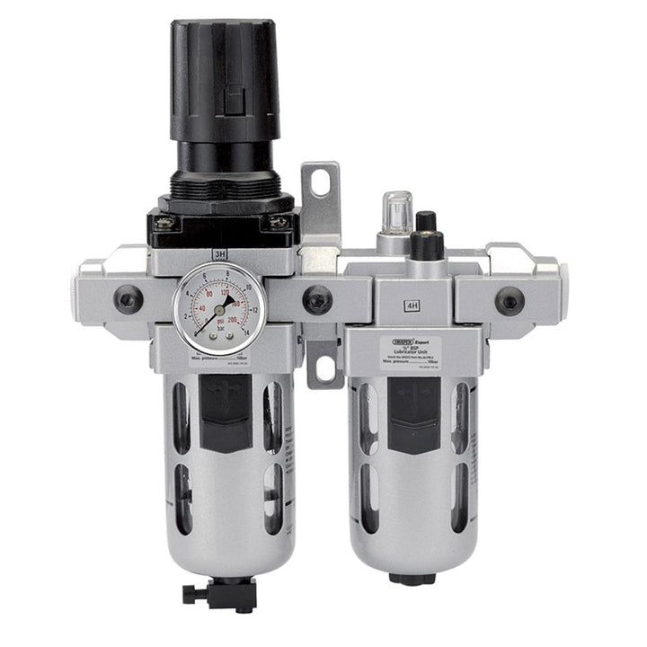 Luchtbehandelingseenheid, aanbevolen voor compressoren> 200 L. Ontworpen om de uitvoer luchtdruk te regelen, vocht en verontreinigingen uit de luchtstroom te verwijderen en gereedschap te smeren tijdens het gebruik. Geleverd met wandbevestiging en manometer. Druk: 0 A 10Bartentry/output Three: 1/2 "