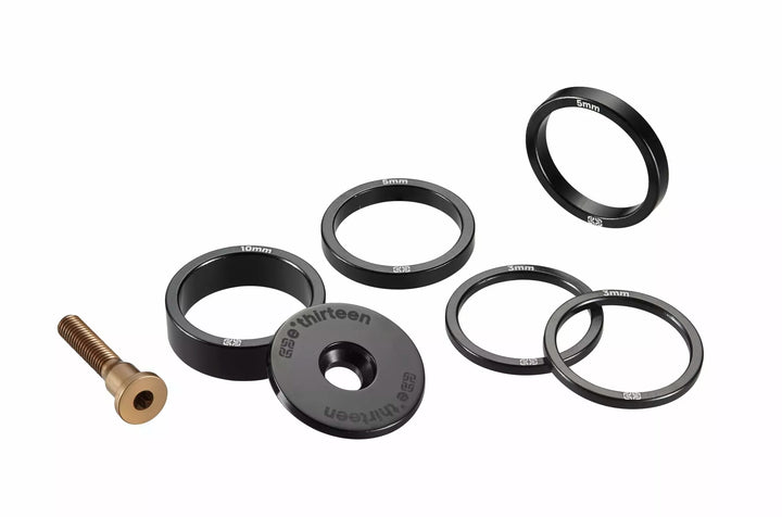 Leg je rit op met E*Thirteen's Top Cap & Headset Spacer Kit! , Verminder het gewicht en voeg hoogwaardige stijl toe terwijl je je cockpit verfijnt. , Ervaar een verhoogde sterkte en prestaties met geanodiseerde legering bovenkap en 7075 AL Bolt. , De lichtgewicht, low-profile legeringsopkap integreert perfect met E*dertien stengels, maar is even thuis op de meeste stengels op de markt. , Bouten zijn briljant geanodiseerd in kleuren die overeenkomen met E*dertien plus stengels en andere componenten. , T25 Hardware betekent enkele toolaanpassingen van elk deel van uw E*dertien bar/stengelconstructie., 5 zwarte geanodiseerde legeringsheadsetafstandspaciers in meerdere maten zorgen voor de ultieme flexibiliteit in stijging aanpassing. , Maat: 34,8 mm diameter., Gewicht: 33 g/kit., Bereik van levering: bovenkap, stuurbout, 1x10 mm, 2x5 mm en 2x3 mm zwarte geanodiseerde legeringsheadset spacers.