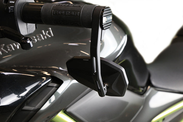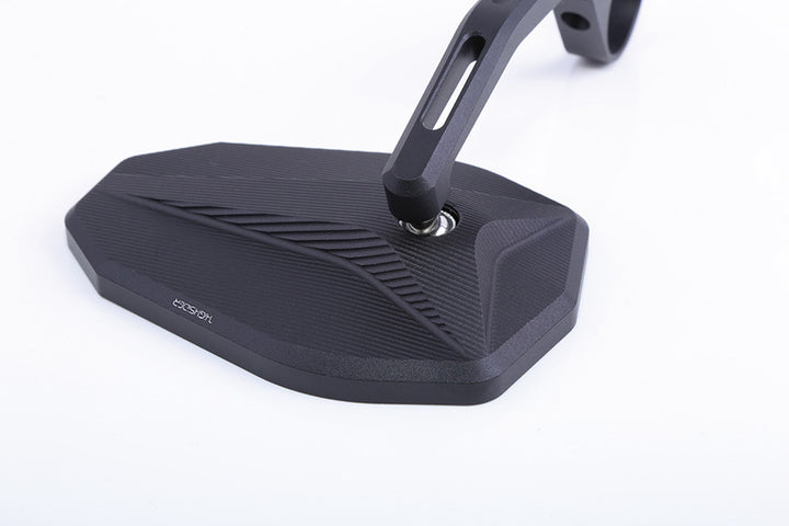 Een elegante kale eindspiegel met een kop van zwart geanodiseerd aluminium. Het gedetailleerde CNC-verwerkte oppervlak met tracks maakt Highsider Victory-X nog geavanceerder en geeft de tijdloze vorm een nieuw optisch hoogtepunt. Past zowel 1 inch (25,4 mm) als 7/8 inch (22 mm) het stuur en kan worden gebruikt aan zowel de linker als de rechterkant. E goedgekeurd.