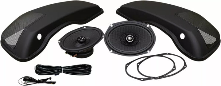 Sprekers schuin naar Rider voor Beste Sound, omvatten 200 watt 2 ohm XL XL-serie 6x9 ヤ Luidsprekers gemaakt voor motorfietsomgeving, sprekers hebben koolstofvezel woofer kegels, betere basrespons en zorgt voor een hoger vermogen Hoge kwaliteit) fabrieksoverschrijdend/vergrendelingsmechanisme Bolt in nieuwe deksels, ingebouwde waterafvoersysteem. en alles vereist hardware is inclusieve Hogtunes -versterker of andere versterker, een versterker is vereist voor de juiste werking