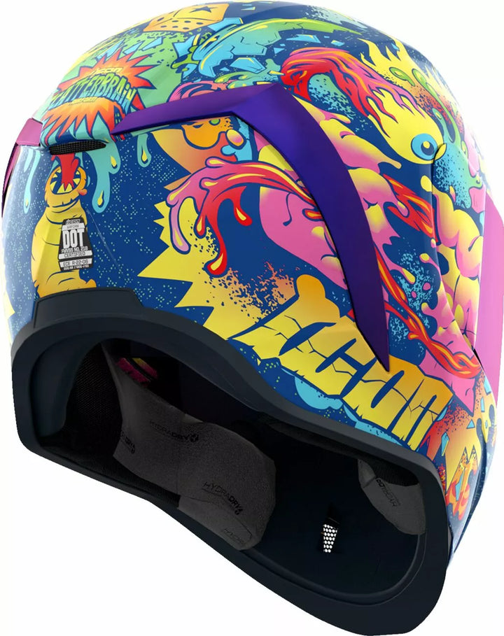 Spuitgegoten polycarbonaatschaal voor sterkte, interne luchtstroomgeometrie, continu ventilatiesysteem, beeldhoeren halsrol, FAG-vrij pictogram Optics ™ -schil met Rapid-Reale ™ -systeem, Prock ™ Positive Shield ™ Schrijfsysteem, Interne druppel High Visor Wicking Liner Liner, Removeered Molded Molded Molded Molded Molded Molded Molded Molded Molded Molded Molded Molded Molded Smoted Liner, Interne, Intern Sprekerzakken werken met Icon's R.A.U. Bluetooth -apparaat, inclusief Dark Smoke Dropshield, inclusief Clear & RST Purple Optics Shield ™