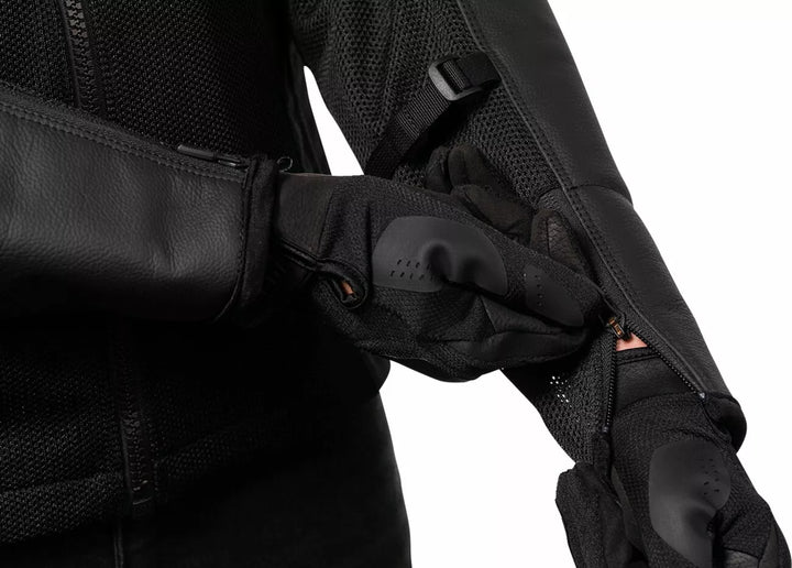 Duurzaam 300D Polyester en Iron Weave ™ mesh-chassis, 1,2 mm-1.4 mm TracSpec ™ leer in primaire crashzone, verstelbare taille- en armband, Icon® Sport Fit, YKK® Zippers, Back Protector EN 1621-2 Niveau 1, EN170-70-2