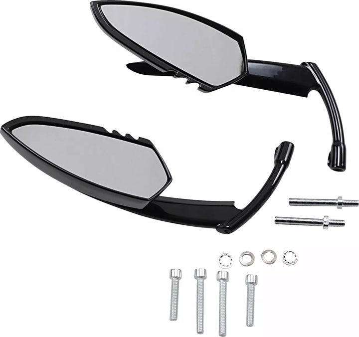 Mirror stengel roept het uiterlijk op van een sikkel., Mirror kop lijkt op een overlevingsmes., Stam en spiegelkop worden verbonden door een bol en socket verbindingsmechanisme voor eenvoudige afstelling., Spiegelkop meet 5-1/2/2 "x 2".