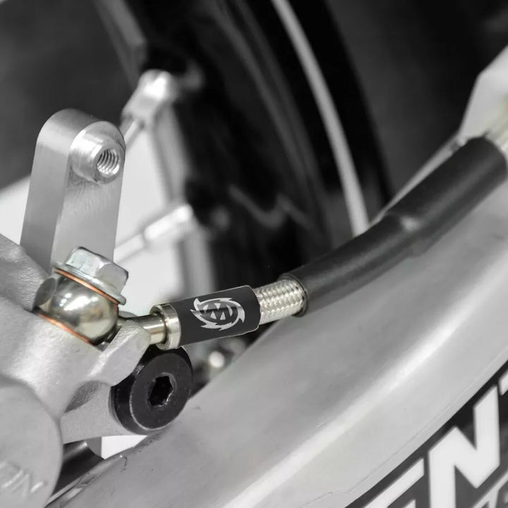 PTFE -slangvoering met een roestvrijstalen bekabelde vlecht die wordt beschermd door een duurzame en lichtgewicht PVC -bedekking., Roestvrij stalen banjo's worden gebruikt om elke mogelijke corrosie te elimineren. instructies., Roestvrije gevlochten remlijnen elimineren dat モ sponsachtig gevoel van standaard plastic remleidingen.