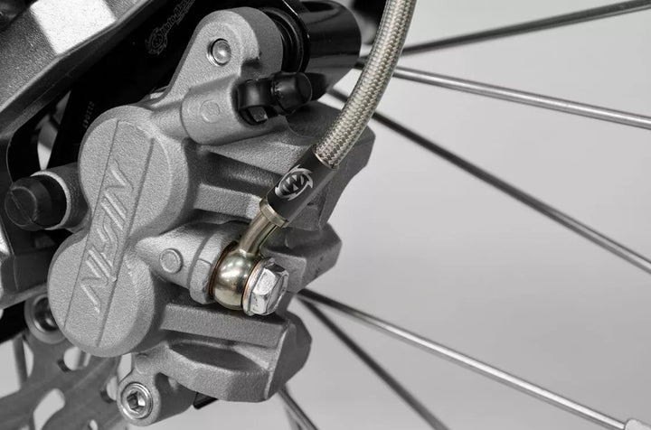 PTFE -slangvoering met een roestvrijstalen bekabelde vlecht die wordt beschermd door een duurzame en lichtgewicht PVC -bedekking., Roestvrij stalen banjo's worden gebruikt om elke mogelijke corrosie te elimineren. instructies., Roestvrije gevlochten remlijnen elimineren dat モ sponsachtig gevoel van standaard plastic remleidingen.