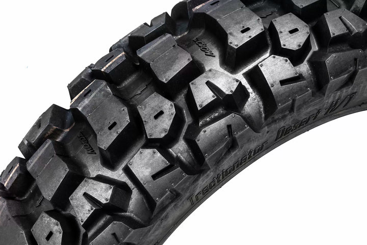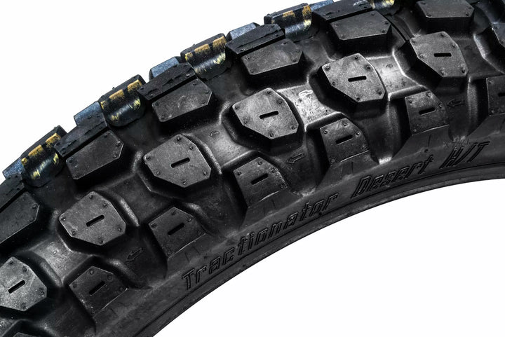 Zware voorkant van de voorkant goed op zware fietsen, bedoeld voor tussenliggend hard terrein en rallygebruik, uitstekende tractie in gevarieerd terrein