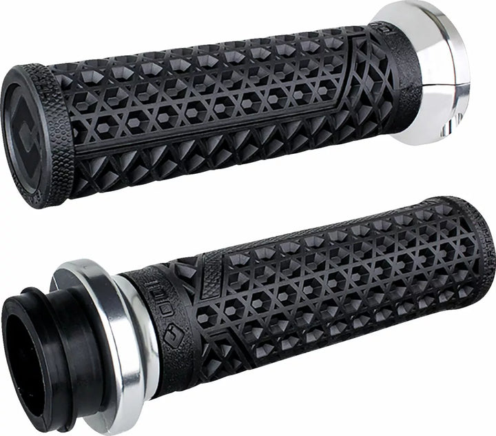 The Vans V-twin Lock-on Grip System Feature The Classic Vans ᆴ Waffle Sole Pattern And are Built to Deliver An amazing Riding Experience, 100% Slip-Free Performance Guaranteed, In-Molded Throttle Tube With Integratuation, SIDE CLAMP Eliminates The Need for Grip Glue or Safety Set-Sscrews, Providing Simple Installation and Removal, T15 Torx Bolts Provide Extra Secure Clamping For Solid, Twist-Free Mounting, Proprieth Wydium Medium-samengestelde durarometflens, gemaakt in de VS.