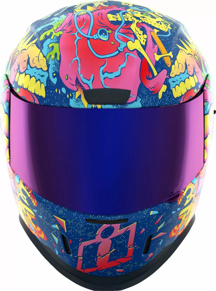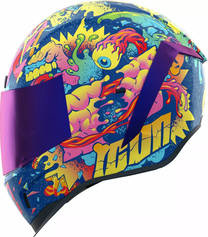 Spuitgegoten polycarbonaatschaal voor sterkte, interne luchtstroomgeometrie, continu ventilatiesysteem, beeldhoeren halsrol, FAG-vrij pictogram Optics ™ -schil met Rapid-Reale ™ -systeem, Prock ™ Positive Shield ™ Schrijfsysteem, Interne druppel High Visor Wicking Liner Liner, Removeered Molded Molded Molded Molded Molded Molded Molded Molded Molded Molded Molded Molded Molded Smoted Liner, Interne, Intern Sprekerzakken werken met Icon's R.A.U. Bluetooth -apparaat, inclusief Dark Smoke Dropshield, inclusief Clear & RST Purple Optics Shield ™