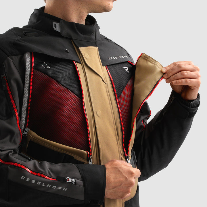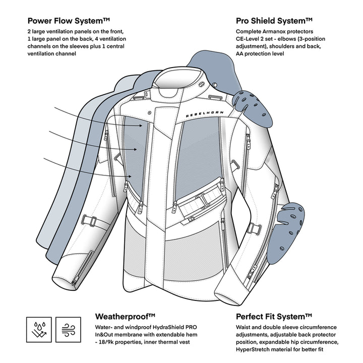 Klaar voor alle wegen, alle weersomstandigheden en alle avonturen - Rebelhorn Hardy 3.0 Is het touringjack dat comfort, bescherming en functionaliteit naar een geheel nieuw niveau brengt. Het is gebouwd voor degenen die regen, hitte of lange mijlen niet in de weg staan ​​van de volgende beurt. Met zijn geavanceerde 3-winkels systeem past Hardy 3.0 soepel aan zowel aan het klimaat als de rijstijl, of je naar Noord-Kaap rijdt of een zondagsreis in de regen maakt.