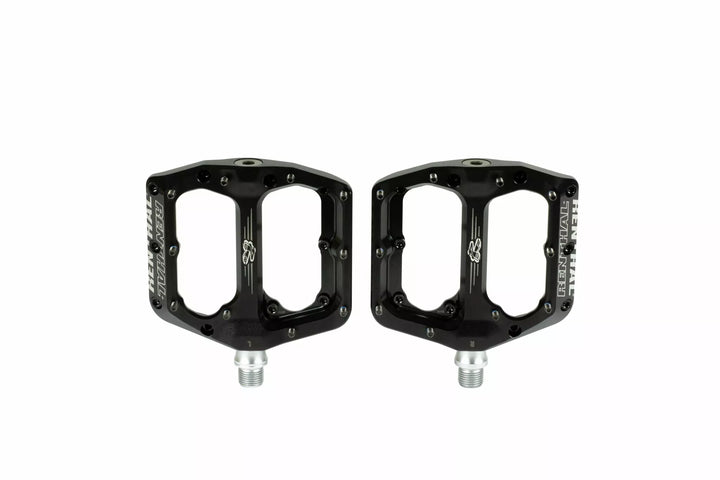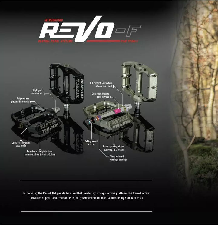 Introductie van de Revo-F platte pedalen van Renthal. , Met een diep concaaf platform, de Revo-F biedt ongeëvenaarde ondersteuning en tractie., Groot parallellogram lichaamsprofiel., Tunable pinhoogte in stappen van 1 mm van 2,5 mm tot 5,5 mm, hoogwaardige chromoly as. IgUS -bus en volledig contact en lage wrijvingsboordhoofdafdichting., Plus, volledig bruikbaar in minder dan 3 minuten met behulp van standaardgereedschap.