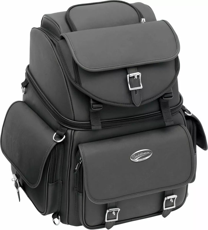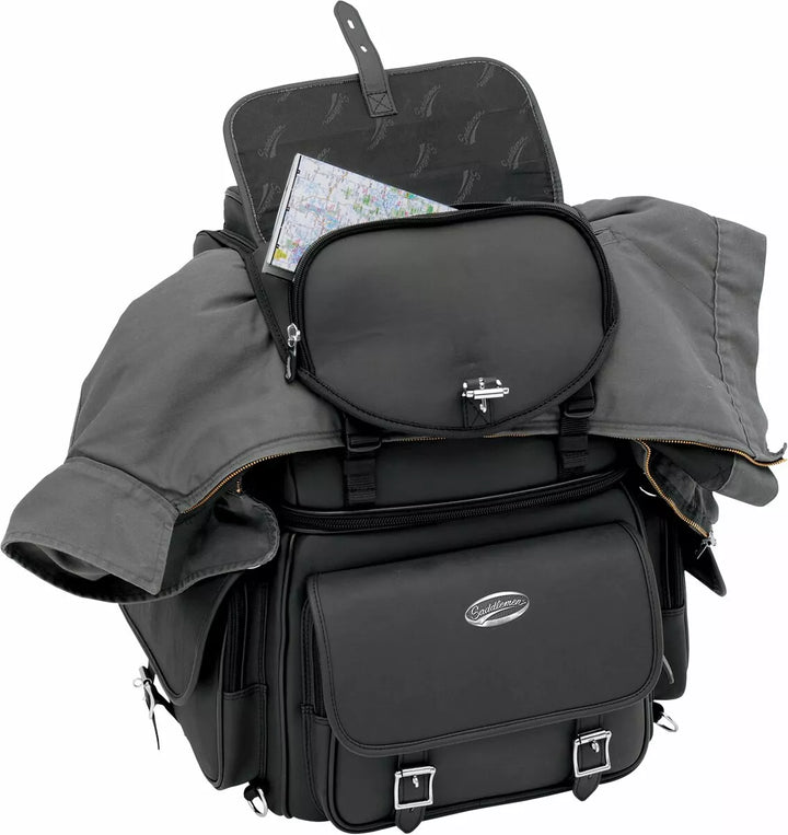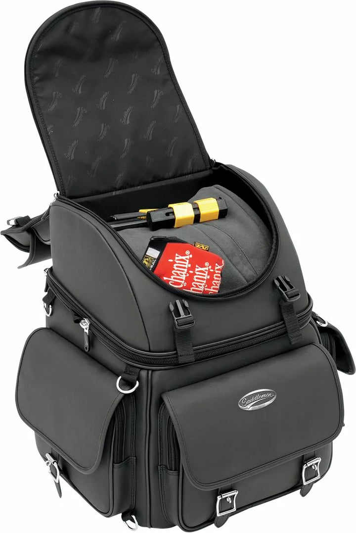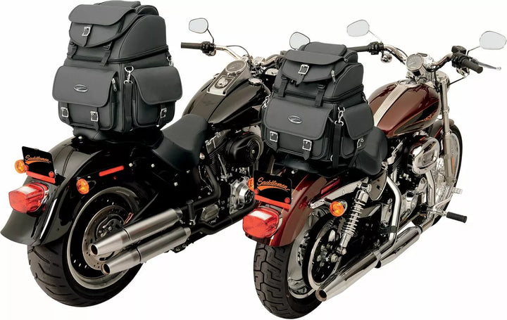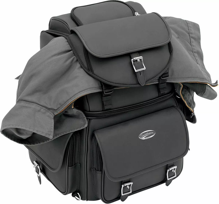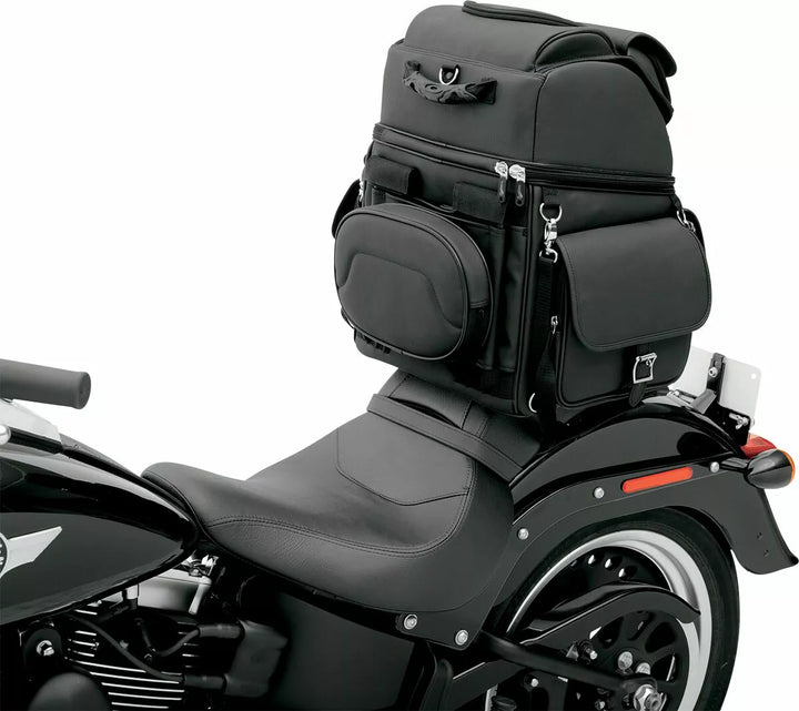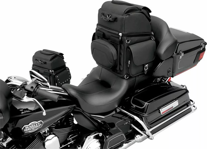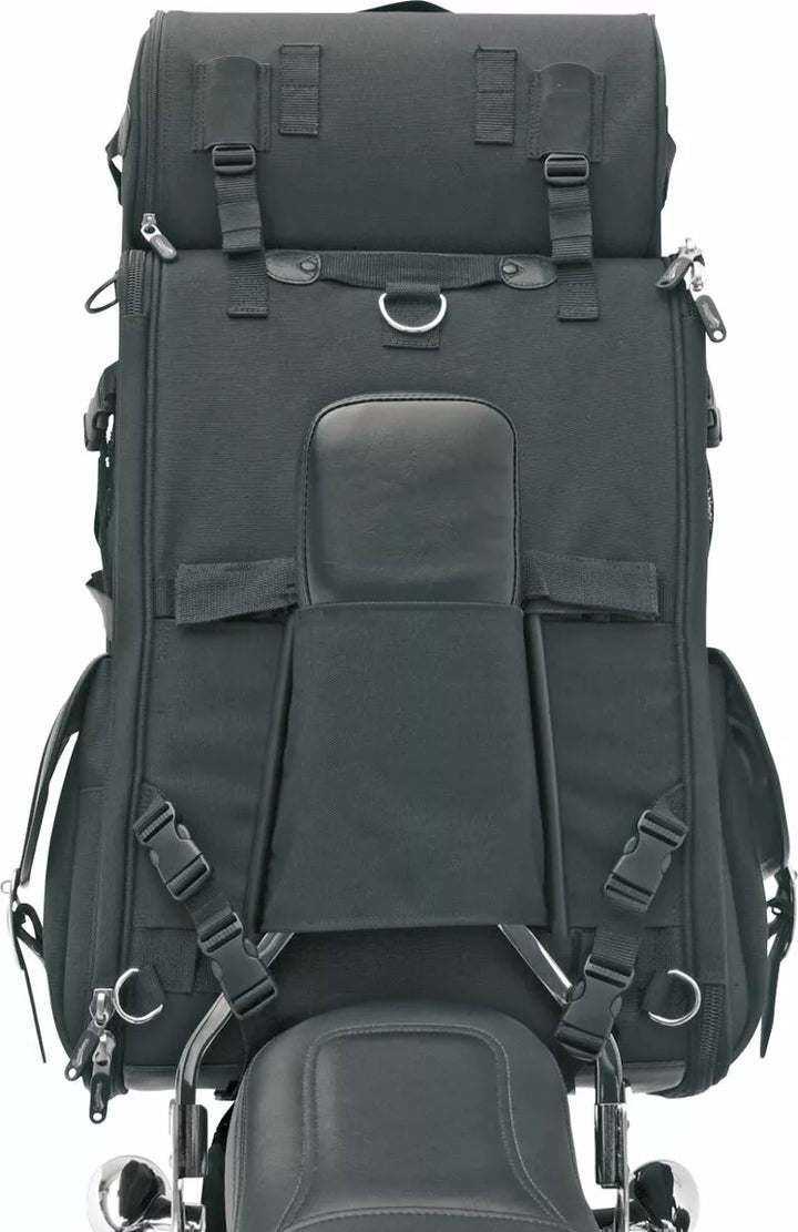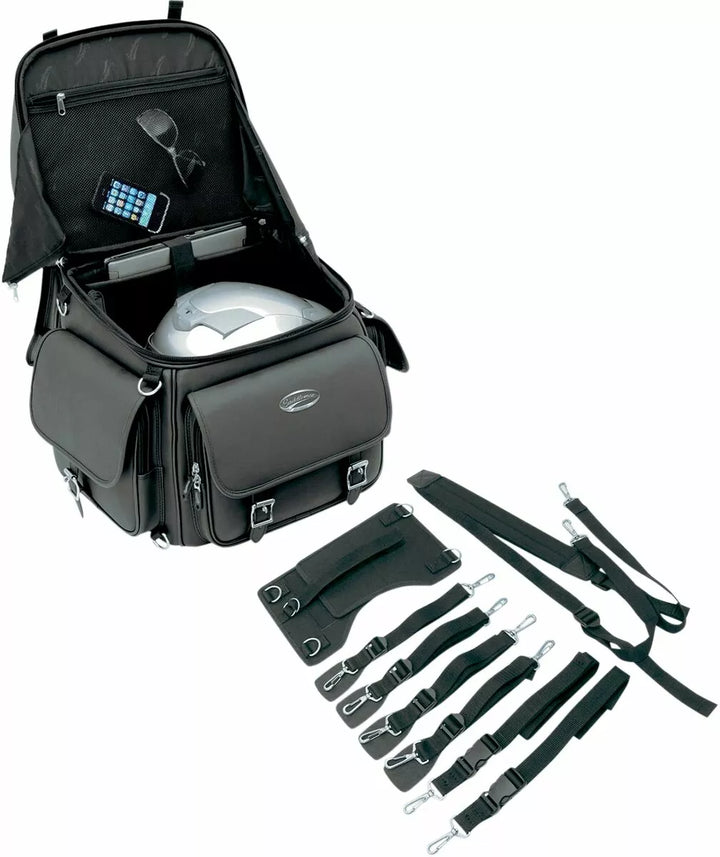 Rugged Blend of Leather-Grained Materials Looks Great On Any Type of Motorcycle, Rigid Internal Structure is Strong Enough to Lean On, Even When Empty, No Sissy Bar Required, Two Mounting Systems inc Bag to motorcycle seat, luggage rack, or sissy bar, included backrest pad can be adjusted for additional comfort for the passenger or drives, sturdy grip handle for convenient carrying, includes detachable backpack straps for easy off-the-bike jaunts, Top-loading hoofdcompartiment, opgevoelde opslagcompartiment past kleine laptop, vier externe zakken en vijf interne mesh-zakken, gemakkelijk te gebruiken zijgesomen op elke riem op elke riem, decoratieve Chrome Chrome Chrome-gebergten bieden stijl, regenhoes met beveiligingstetber aangepast om een jas te dragen, mini-padlock voor beveiliging (inclusief extra kubus; Eén full-face helm plus andere lading, EU-metingen 35,56 cm 48 cm vrachtcapaciteit 55,72 L, heeft een full-face helm plus andere lading.