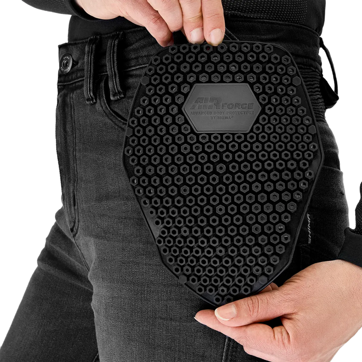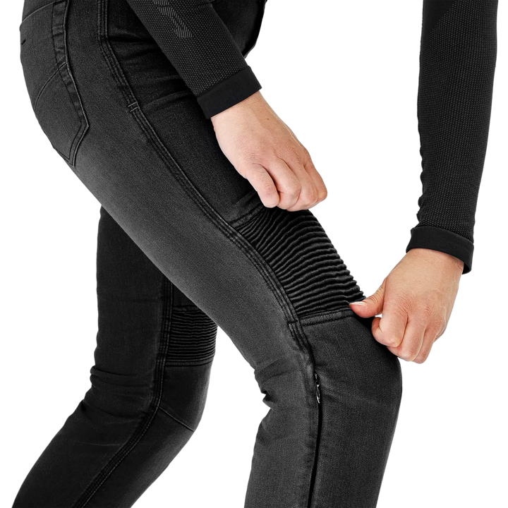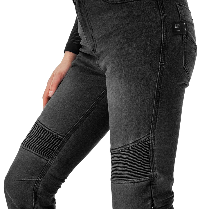 De broek is uitgerust met Airforce-stoel (niveau 1) En Hoogte-verstelbare GFLEXX-Knäsk-bescherming (niveau 2) Zoals in zitten in Buitenzakken - waardoor het gemakkelijk is om ze aan te passen zonder de jeans te verwijderen. Lady Fit Pass -formulier Is op maat gemaakt voor vrouwelijke anatomie en combineert stijlvol silhouet met bewegingsvrijheid. Rekpanelen en harmonieweken over de knieën en tijdens de tailleband neemt de flexibiliteit verder toe.