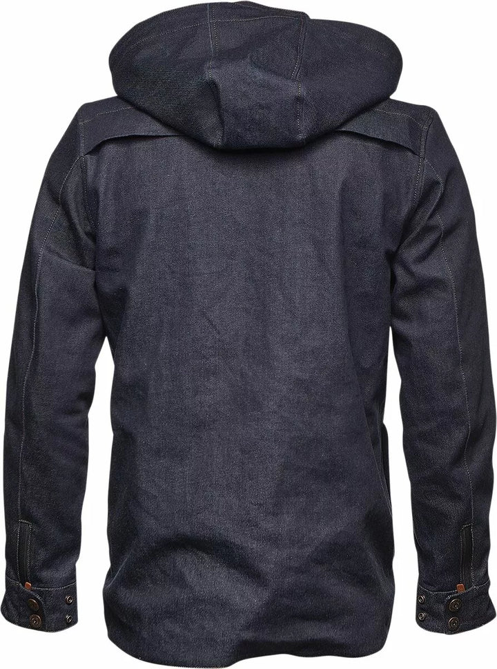 Vintage Inspired Design, Premium 2-Way Stretch Cordura® Denim, With Black Satin Lining, Removable Zip Off Hood With Cord Lock Adjusters, Micro Fleece Lined Extended Collar for Increased Coverage, Quilted, Insulated, Removable West Liner, Front Liner, Front Liner, Front Liner, Front Liner, Front Lin Accessible Through Vest Liner, Two Interior Chest Pockets, Adjustable Wrist Closure, Full Back Vent With Cover Flap, Brass Hallman Branded -knoppen, twee voorste handzakken met ritssluiting, Hallman Branded Zipper Pulls, YKK Zippers