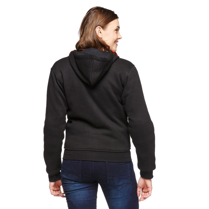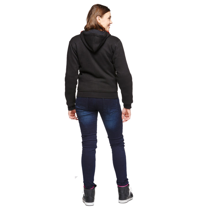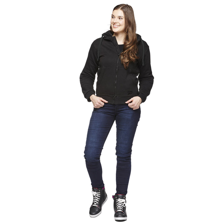Sweep Kevlar Mc-Hoodie voor dames is een Comfortabel en stijlvol Zwarte motorfiets hoodie, perfect voor warme dagen. Gemaakt van dik en zacht katoen, versterkt met Aramide vezels Voor extra duurzaamheid en veiligheid. De hoodie heeft Verwijderbare CE EN1621-1 goedgekeurde bescherming in schouders en ellebogen, die schokken effectief absorberen in het geval van een ongeval.