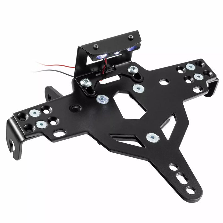 De kentekenplaathouder is extreem duurzaam en weerbestendig., Zwart poeder bedekt. , De kentekenplaathouder kan worden gebruikt voor elke soort kenteken (175 mm breedte)., Geen wijziging van de vereiste kuip., Stepless aanpassing van de harkhoek., Indicatorondersteuning in 3 posities. Plaat., Speciale indicatorlichtmounts (afzonderlijk verkocht) vereist voor stockindicatorlichten., Kit omvat: 1 kentekenplaathouder incl. Montagekit., LED -kentekenlampje "e goedgekeurd" incl. Steun. Van: Zwitserland, Polen en Ierland.